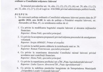 Prin Dispoziția Primarului nr. 141 din 17 aprilie 2026, se convoacă ședința ordinară a Consiliului orășenesc Ialoveni.